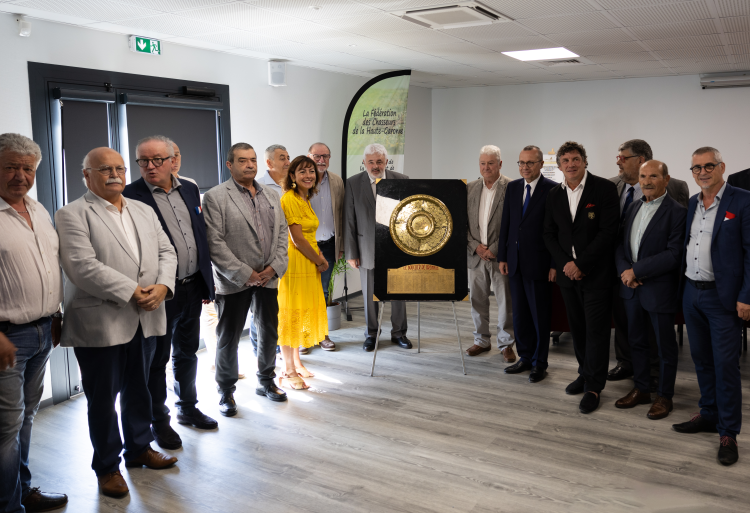 Les Présidents des Fédérations Départementales des Chasseurs d'Occitanie avec les élus régionaux et départementaux posent avec Didier Lacroix autour du bouclier de Brennus.