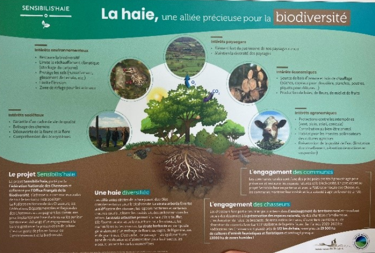 Le projet Sensibilis'haie, porté par la Fédération Nationale des Chasseurs et cofinancé par l'Office Français de la Biodiversité, s'adresse aux communes rurales de l'ensemble du territoire métropolitain. Il consiste à la mise à disposition aux communes de kits de plantation prêts à l'emploi, en échange de leur engagement à la préservation de la haie. Grâce à ce projet, en 2022, environ 572 kilomètres de haies ont été plantés sur toute la France.