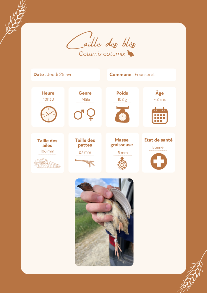 Le jeudi 25 avril, le Service Suivi de la Faune Sauvage de la FDC31 a bagué sa première caille sur la commune du Fousseret ! Des données sur les caractéristiques de l'individu ont été collectées telles que, son âge, son poids, ses mensurations (ailes, pattes et cloaque) ainsi que sa masse graisseuse. Nous vous invitons à découvrir ci-dessous la fiche des informations de la caille baguée.