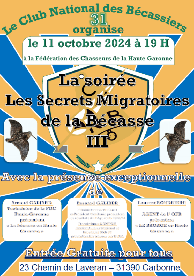 Rendez-vous à la Fédération des Chasseurs de la Haute-Garonne - 23 chemin de Laveran - 31390 Carbonne le vendredi 11 octobre 2024 à 19h.