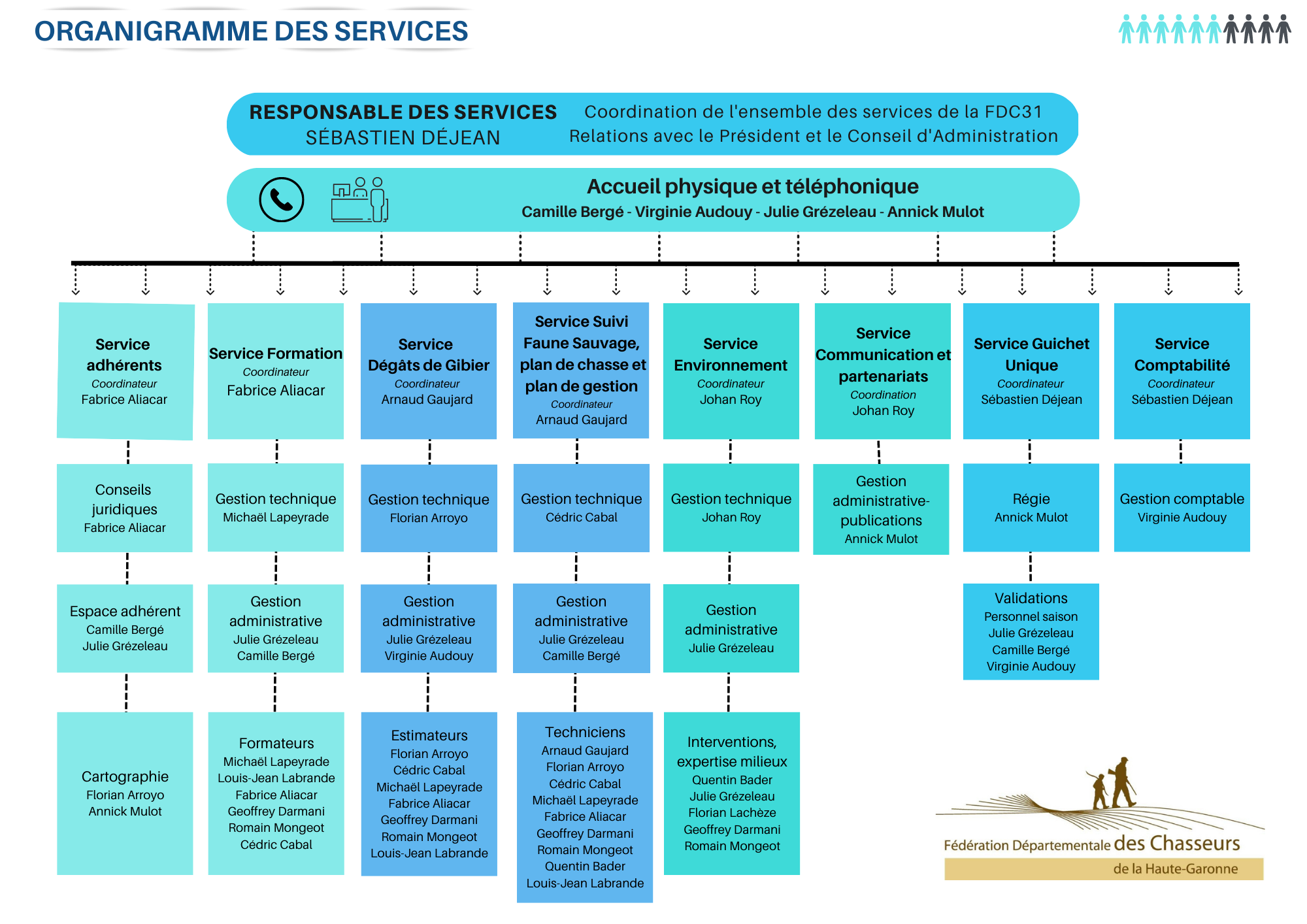 Le personnel administratif assure l'accueil, la gestion des formations, la comptabilité, la délivrance des permis de chasser... Organigramme FDC31