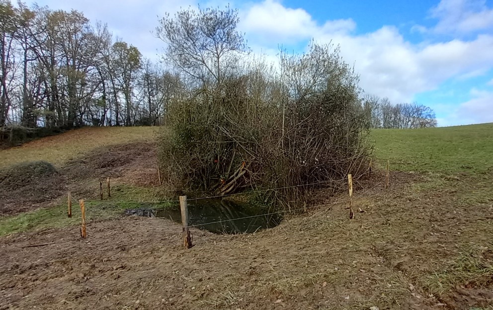 Au programme : débroussaillage sur une partie des berges (l'autre partie ayant été conservée afin de créer une « barrière naturelle » limitant l'accès des berges au bétail), retrait des saules ayant envahi la mare et léger remodelage des berges en pente douce.