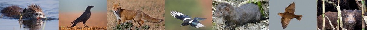 Catégorie I- Niveau national - Ragondin (Myocastor coypus) Rat musqué (Ondatra zibethicus) Vison d'Amérique (Mustela vison) Chien Viverrin (Nyctereutes procyonoides) Raton laveur (Procyon lotor) Bernache du Canada* (Branta canadensis) |