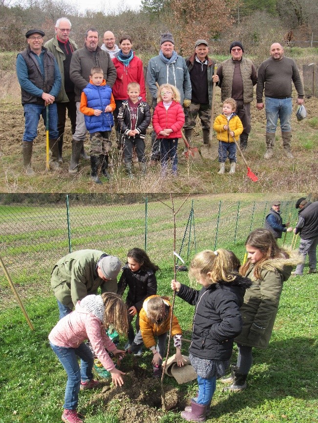 (Les planteurs de la haie fruitière, le 29/02/2020 et les élèves du groupe scolaire de la Haute Barguelonne lors de la plantation du 02/03/2020.)
