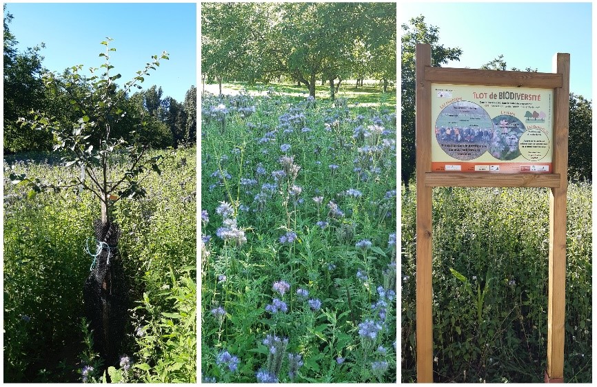 (Un plant de fruitier, le couvert mellifère et le panneau de l'îlot de biodiversité de la commune du Roc.)