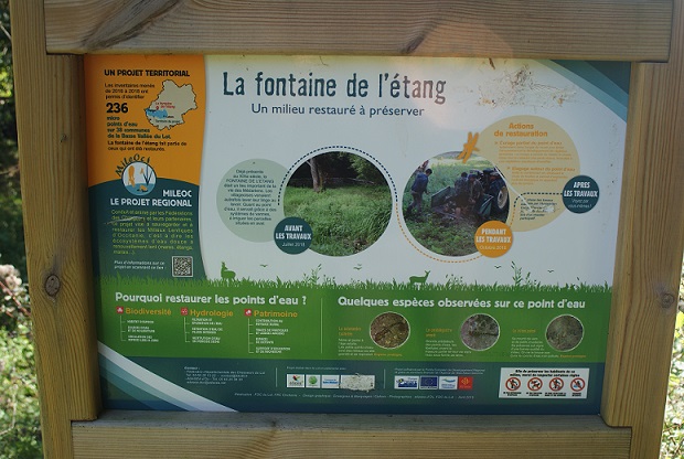 Panneau d'information grand public dont les mots "chasse", "chasseurs", "Fédération" et "Association" sont détruits régulièrement avec un poinçon. Un geste irrespectueux pour celles et ceux qui ont œuvré localement pour cette action très favorable à la biodiversité.