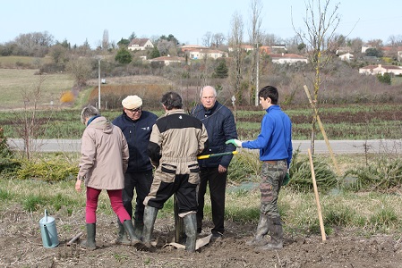 Munis de pelles et pioches, une trentaine de personnes motivées, dont des enfants en activité périscolaire, se sont réunies le 24 février 2022, sur une parcelle communale. Vingt arbres fruitiers (variétés anciennes et locales) ont été plantés ce jour. L'association de chasse complètera le dispositif par le semis d'un couvert mellifère et fleuri. Cet îlot de biodiversité sera favorable à la petite faune sauvage et aux pollinisateurs.