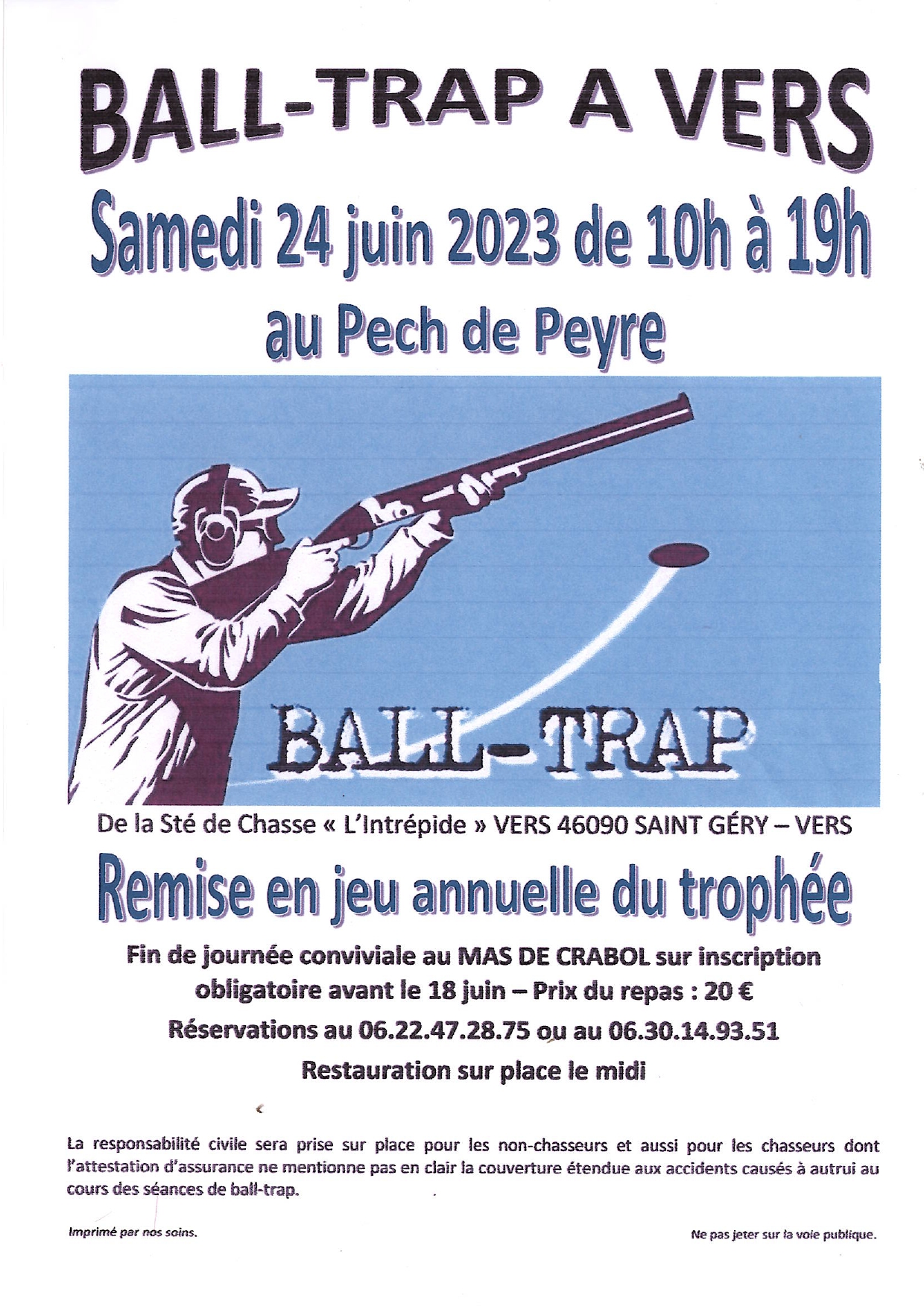 Ball-trap le samedi 24 juin 2023 de 10h00 à 19h00, sur la commune de Vers au Pech de Peyre, organisé par la société de chasse "l'Intrépide" Vers.