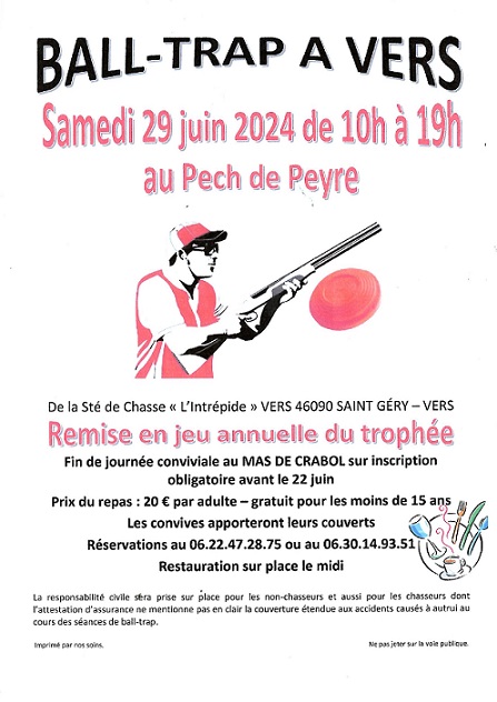 Ball-trap le samedi 29 juin 2024 de 10h00 à 19h00, sur la commune de Vers au Pech de Peyre, organisé par la société de chasse "l'Intrépide" Vers.
