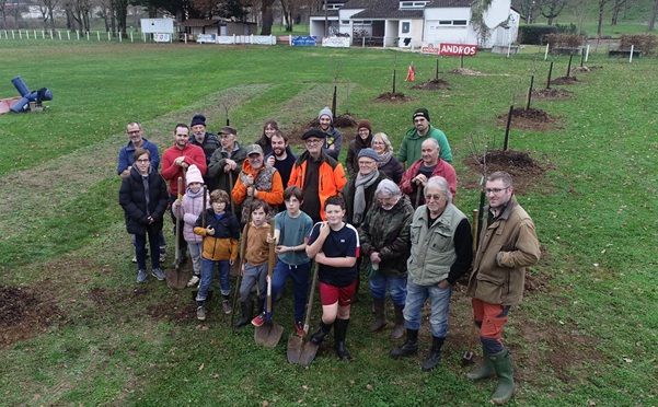 Dans le cadre du programme « Ilot de Biodiversité » * financé au titre de l'écocontribution, environ 25 personnes motivées se sont réunis le mercredi 17 décembre 2025 sur une parcelle communale, munies de pelles et de pioches. Vingt arbres fruitiers (variétés anciennes et locales) ont été plantés ce jour.
