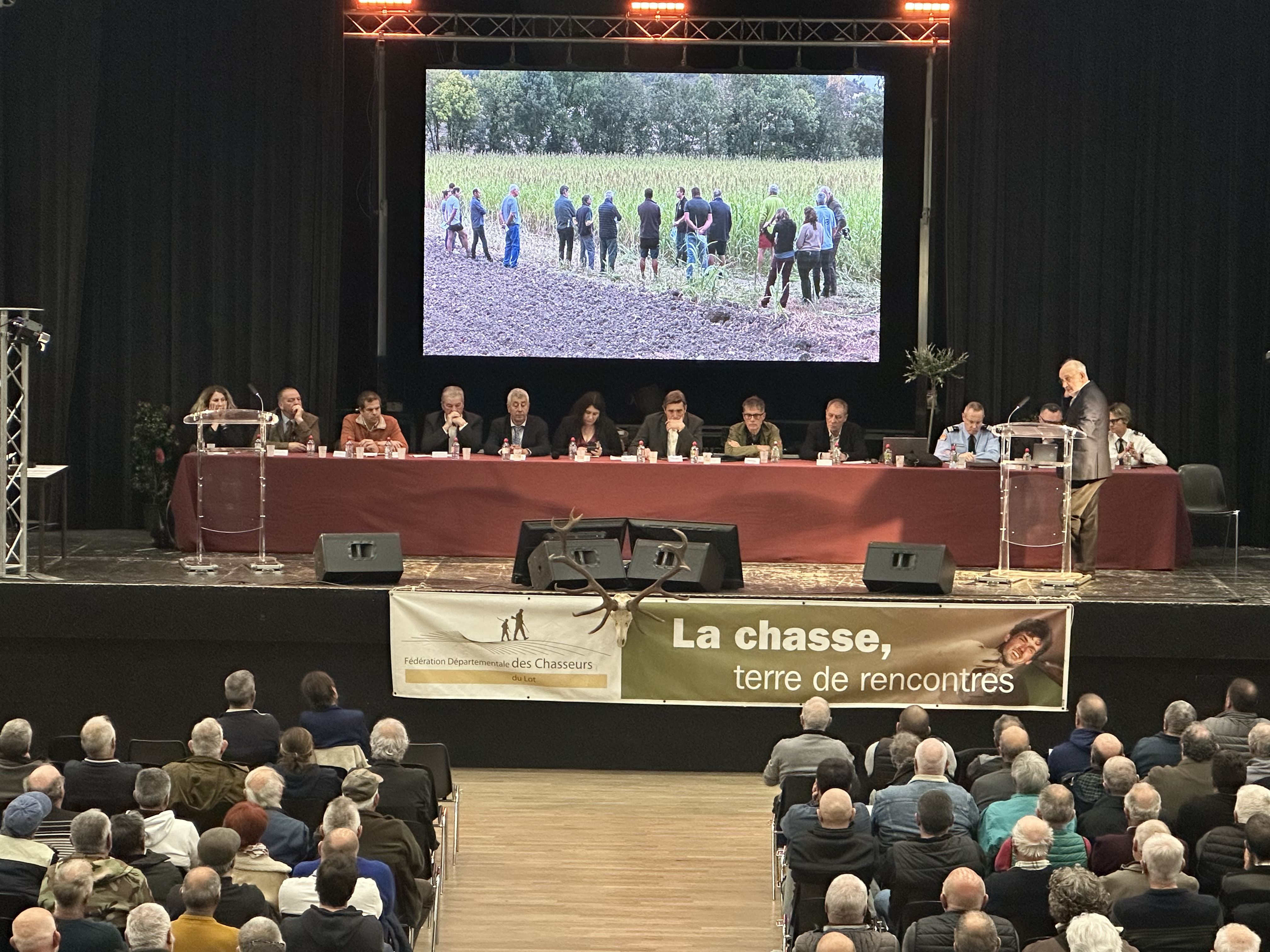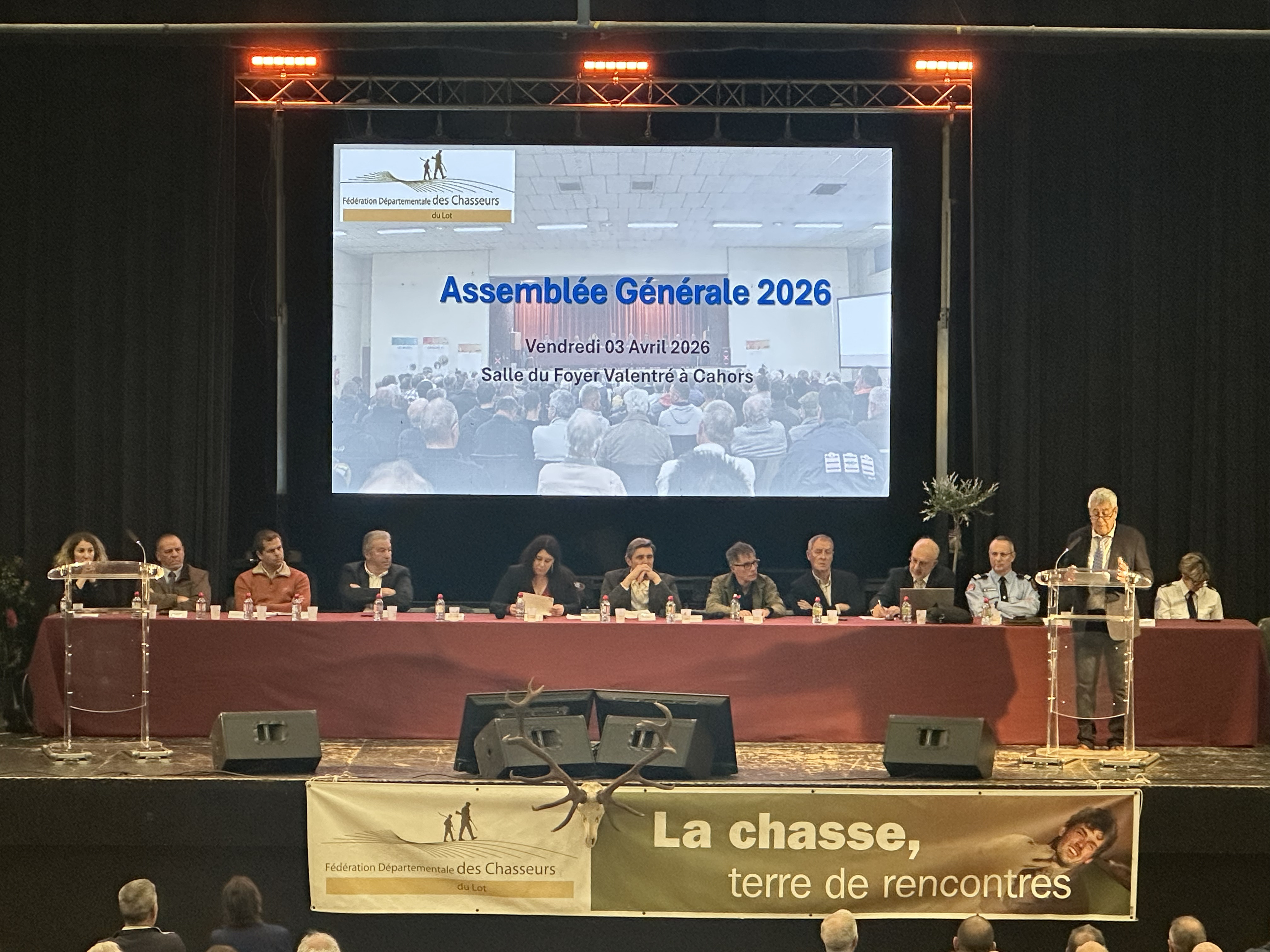 La Fédération Départementale des Chasseurs du Lot a tenu son assemblée générale vendredi 3 avril 2026 au Foyer Valentré de Cahors. Michel Bouscary, président de la Fédération, a ouvert la séance devant près de 400 participants, réunissant représentants d'associations de chasse, chasseurs, les partenaires (Chambre d'Agriculture, etc.), les services de l'État représentés par Madame la Préfète et ses services (DDT, OFB), ainsi que les élus locaux, parmi lesquels le sénateur, le député et la mairie de Cahors.