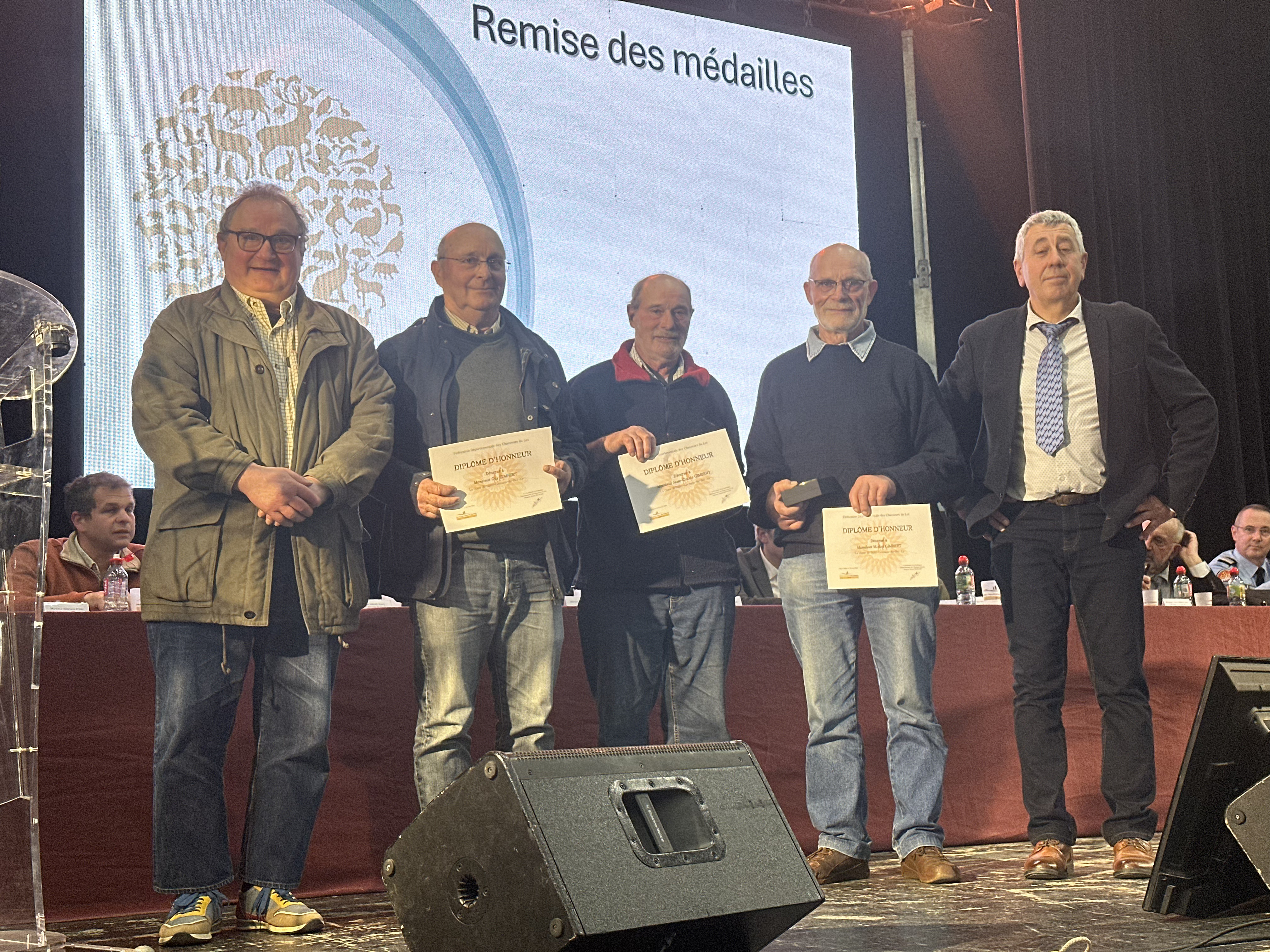 Par ailleurs, trois frères chasseurs (Michel GIMBERT, Jean-Claude GIMBERT et Guy GIMBERT), ont été honorés par la remise de médailles et de diplômes d'honneurs, saluant leur engagement et leur implication au service de la chasse et des territoires.