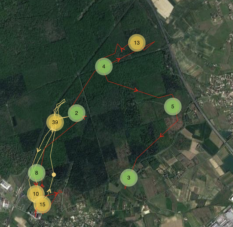 En rouge : trajet de Requiem. En jaune : trajet de Sergio. Les numéros correspondent au nombre de fois ou Sergio et Requiem ont été localisés.